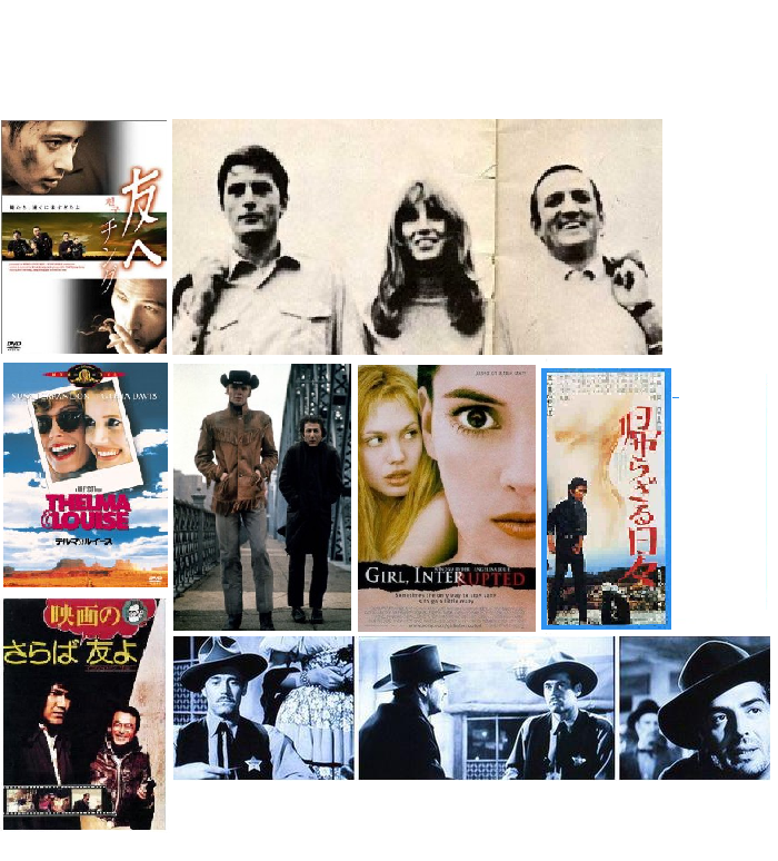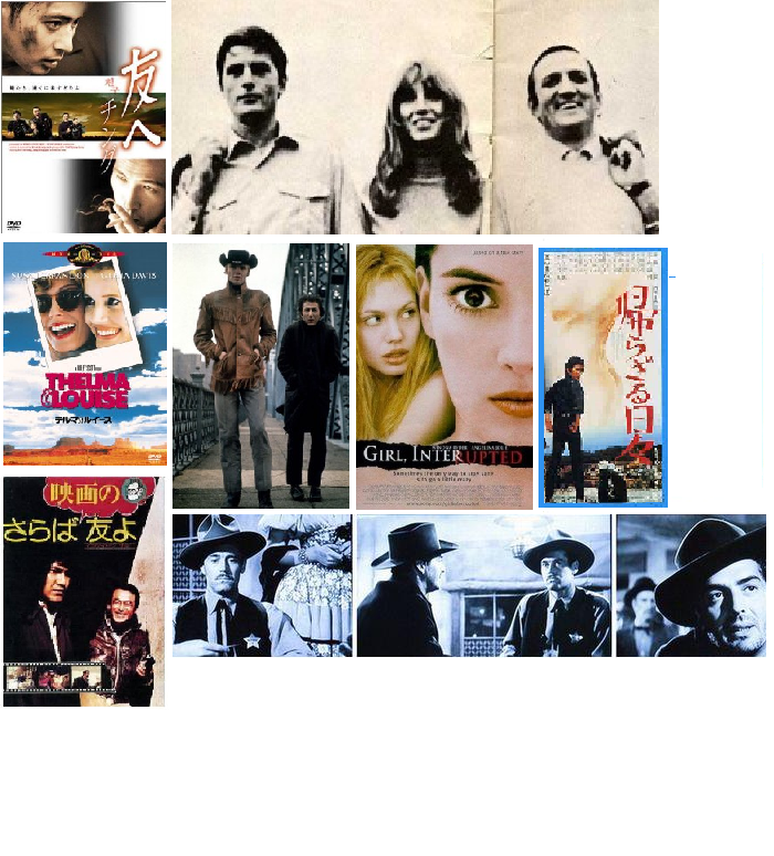 何故主演二人は面白いのか? ライターも監督も、一人には託し切れない己が二面性の分身として、二人を描いているのだ。そこが面白い。 男二人の場合、間に女がいたりいなかったり・・・。 女ふたりはもっと面白い。 作品解説はしませんが、添付画像作品を全部見た人は、相当な映画通。どれもよかったね! 上、左から: 『ワンス・アポン・ア・タイム・イン・アメリカ』 『ジュリア』 『チング』 『冒険者たち』 『テルマ&ルイーズ』 『真夜中のカウボーイ』 (余談: ジョン・ヴォイトさん、お嬢さん=アンジェリーナ・ジョリーさんは、最近ますます貴方に似てきましたね!) 『17歳のカルテ』(これは99年、アンジー25歳の作品) 『帰らざる日々』 『さらば映画の友よ』 『荒野の決闘』