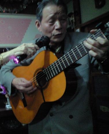 その夜、この84歳氏以外にも「いいもの」に遭った。退散する小一時間前、新橋にただ一人残った「流し」=演歌師がやって来た。この店をベースキャンプにしていると言う。 飲食街を唄い歩き、小休止にここへやって来る。まだ、客もほとんど無い時間に来て食事をし、ママと好爺と話し、また夜の街へ唄いに向かう・・・、それが日課だそうだ。唄うのをやめて呑みに行く時には、ここにギターを置いてゆく。なるほど彼のベースキャンプだ。 最近フジテレビが取材+撮影したそうで、たしか5月15日に放映されるらしい。 『新橋・最後の演歌師』といった内容だそうだ。「流し」始めて五〇年という。なら70歳前後のはずだ。田端義夫に似ていた。